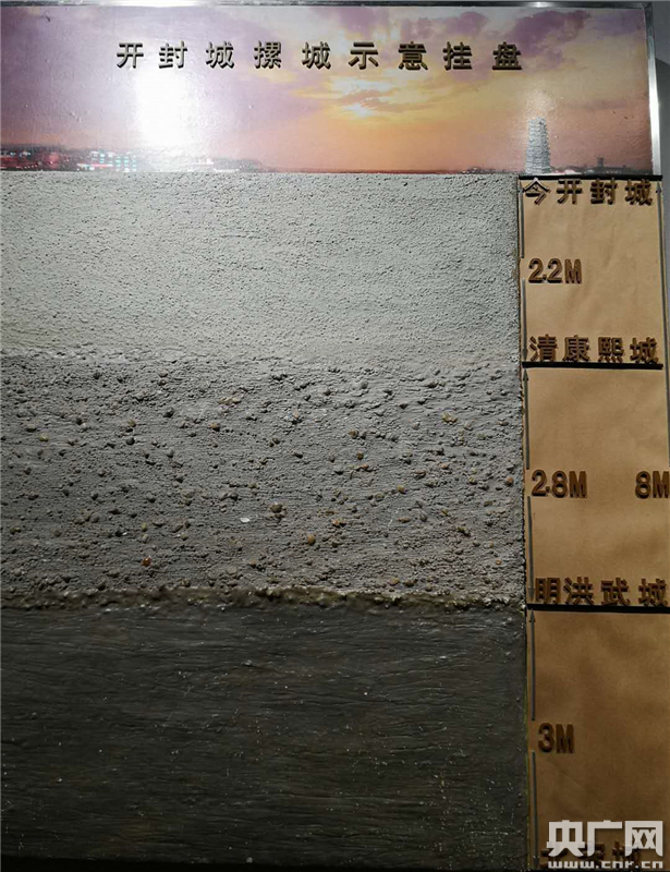 《開封城摞城示意掛盤》,我們可以清楚地看到古城開封城下的三座城池,3米以下的北宋城,2.8米以下的明洪武城,2.2米以下的清康熙城(今開封城)。(總臺(tái)央廣記者 任磊萍 攝)