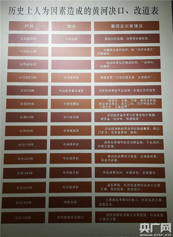 《歷史上人為因素造成的黃河決口、改道表》, 自先秦至民國(guó)的近3000年間,黃河平均“三年兩決口,百年一改道”。明代和清代尤其嚴(yán)重。“道光二十三,洪水漲上天。沖走太陽(yáng)渡,捎帶萬錦灘!边@首陜縣民謠,形象反映了清朝道光年間黃河水泛濫成災(zāi)的現(xiàn)象。(總臺(tái)央廣記者 任磊萍 攝)