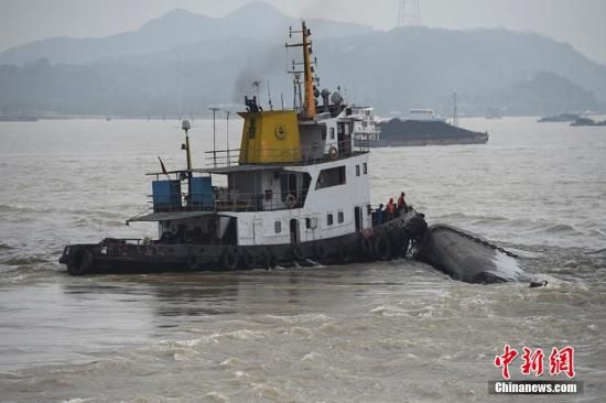 6月18日凌晨,在南京長江二橋水域川田船廠船塢前一艘貨輪傾覆,輪船上載有280噸液堿,船上2人目前失聯。當晚18時左右,海事部門將沉船拖至水流較緩位置進行打撈翻轉救援工作。葛勇攝
