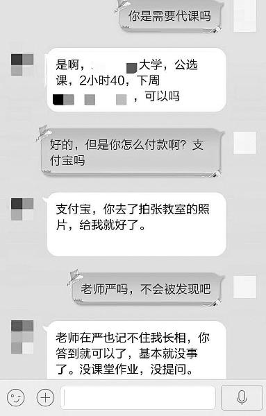 高校學生花錢雇人代自己上課,英語等公共課是“重災區(qū)”,有的學生甚至一學期都找人代課。有需求就有市場,一些在校生覺得兼職“代課”很輕松、來錢又快,他們在微信、QQ群上交流,每周代四五節(jié)課,一個月收入近千元。