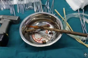 由于竹棍自心臟的右心房膈面穿入心臟,并由右房近左房頂處穿出心臟,經(jīng)右胸頂刺入右頸部,右心房破口處緊鄰右冠狀動(dòng)脈,幸運(yùn)的是胸腔內(nèi)大血管無(wú)損傷,在體外循環(huán)輔助下,醫(yī)護(hù)團(tuán)隊(duì)異物穿出處鋸斷異物,將插入心臟內(nèi)的竹棍截?cái)喟纬,修補(bǔ)心臟破損處,向上繼續(xù)尋找周圍組織的游離異物,見(jiàn)異物緊臨頸部大血管,經(jīng)精細(xì)手術(shù),終于抽出了異物。整個(gè)手術(shù)時(shí)間花了十多個(gè)小時(shí)。