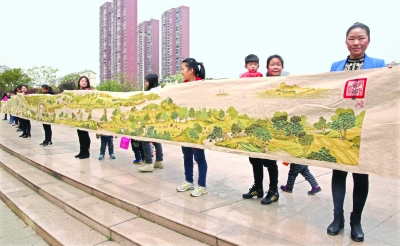 王秀蘭(右一)和市民們拿著“清明上河圖”全景十字繡 涂亞瓊 攝