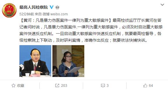 最高檢偵監(jiān)廳廳長黃河今日在答記者問時說,凡是暴力傷醫(yī)案件,一律列為重大敏感案件,必須及時啟動重大敏感案件快速反應(yīng)機制。一旦啟動重大敏感案件快速反應(yīng)機制,就要最高檢督導(dǎo),各級檢察院上下聯(lián)動,及時研判案情,準(zhǔn)確作出反應(yīng);就要依法快捕快訴。