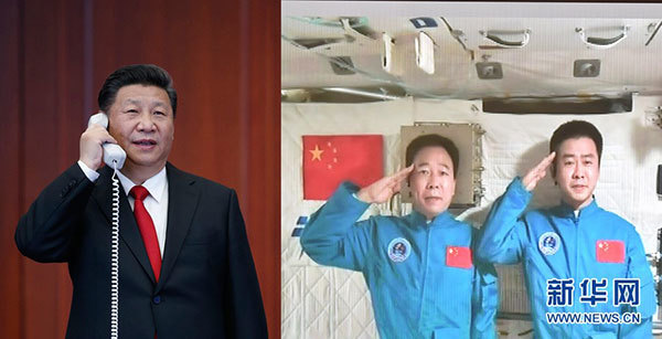 11月9日,中共中央總書記、國家主席、中央軍委主席習(xí)近平來到中國載人航天工程指揮中心,同正在天宮二號執(zhí)行任務(wù)的神舟十一號航天員景海鵬、陳冬親切通話。新華社記者鞠鵬(左圖)、李濤(右圖)攝(拼版照片)