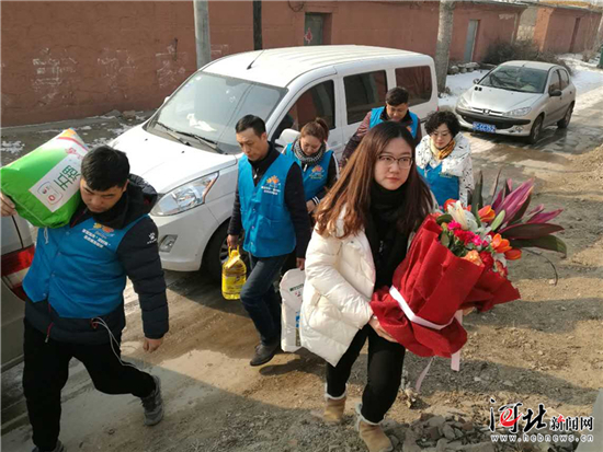 1月24日,秦皇島市文苑百鑫辦公用品志愿服務(wù)隊的志愿者們來到抗戰(zhàn)老兵徐山家中為向老人拜年,為老人送上米面油等慰問品和慰問金,祝老人新年快樂。記者宋柏松攝