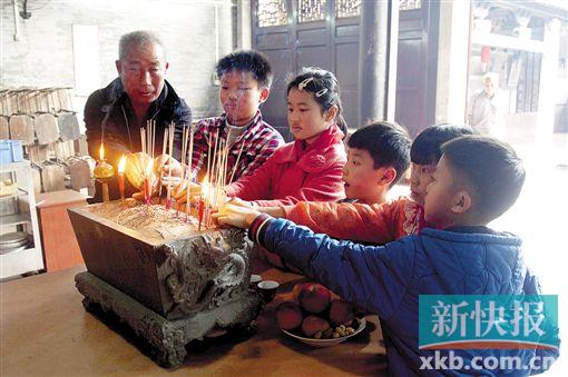■村中長(zhǎng)輩帶著兒童給祖先上香。