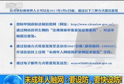 這個(gè)條例的征求意見截止日期到1月6日,在這之前,可以過三種方式提出意見——一個(gè)是通過登錄中國政府法制信息網(wǎng)的方式提出意見,另外一個(gè)過寄信的方式寄到一個(gè)北京市2067信箱,還有一個(gè)過電子郵件的方式把意見發(fā)到郵箱wcnrwlbh@chinalaw.gov.cn里面。這樣的條例準(zhǔn)備出臺(tái)要面對的是一個(gè)什么樣的問題呢?這個(gè)問題是非,F(xiàn)實(shí)的,因?yàn)楝F(xiàn)在對于未成年人來說觸網(wǎng)的年齡更加提前了,觸網(wǎng)的范圍更加擴(kuò)大,觸網(wǎng)的程度更加復(fù)雜……面對這么一個(gè)迫在眉睫的問題,面對普遍家長們非常關(guān)心孩子們成長的問題,條例會(huì)怎樣解決呢?