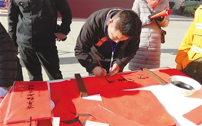 圖為林芝市書法家協(xié)會會員在現(xiàn)場為群眾寫春聯(lián)。