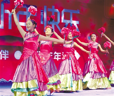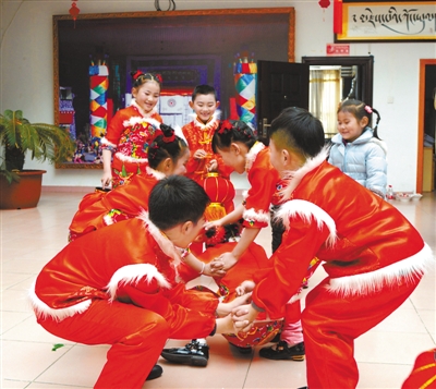 圖為參加林芝市2017年迎新春聯(lián)歡會表演的小朋友們在節(jié)目開始前玩游戲。
