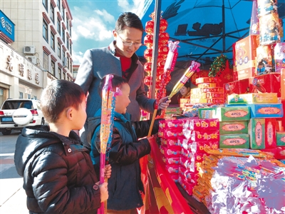 圖為龍先生帶著兩個侄兒在林芝市八一鎮(zhèn)工布民俗街上購買煙花。