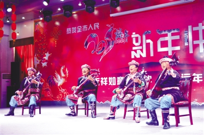 圖為在迎新春聯(lián)歡會上演員彈唱《工布扎年波動》。