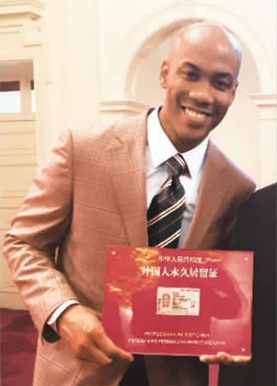 二○一六年四月十八日,北京首鋼隊美籍外援馬布里在北京市人民政府獲得中華人民共和國外國人永久居留證。(新華社發(fā))
