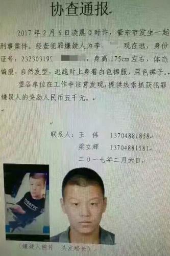 東北網(wǎng)2月6日訊(記者 雷蕾)2月6日0時許,肇東市發(fā)生一起命案,犯罪嫌疑人李某在逃中。當?shù)鼐浇裉彀l(fā)布協(xié)查通報,對提供線索抓獲犯罪嫌疑人的獎勵人民幣五千元。