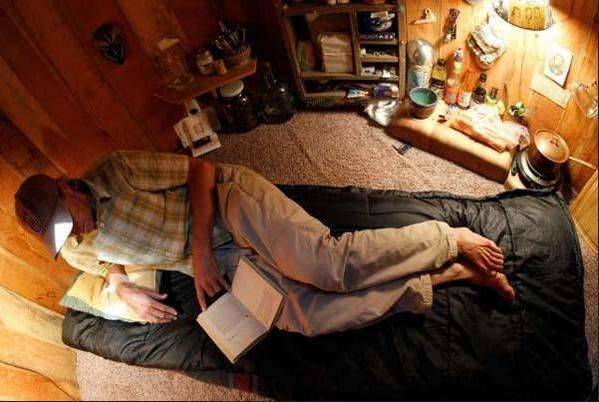 里面的墻壁上掛滿了生活的日常用具,有鍋碗瓢盆,油鹽醬醋,看上去就是一個小廚房一樣,在最里面還放了一張床。整個小屋子里面居然還有電燈,小屋的主人正在里面看著書。