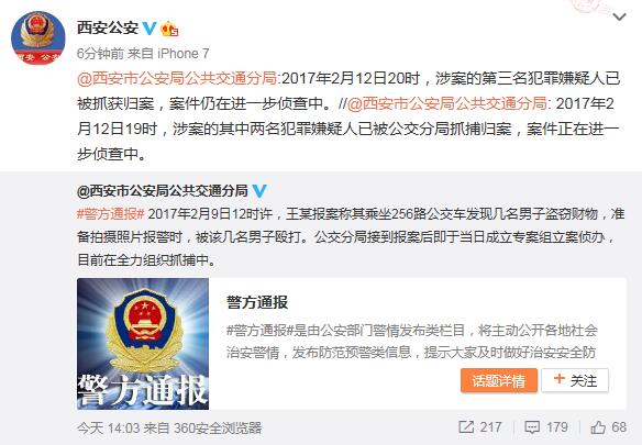 2月9日早上8時許,陜西一公車上少年大聲指認車上小偷組織,卻反遭對方一行人拉下車狂毆。西安市公安局公共交通分局今日表示,2月9日12時許接到報案,當(dāng)日成立專案組。2月12日20時,涉案的第三名犯罪嫌疑人已被抓獲歸案。此前,西安市公安局通報稱,已有兩名嫌疑人落網(wǎng)。