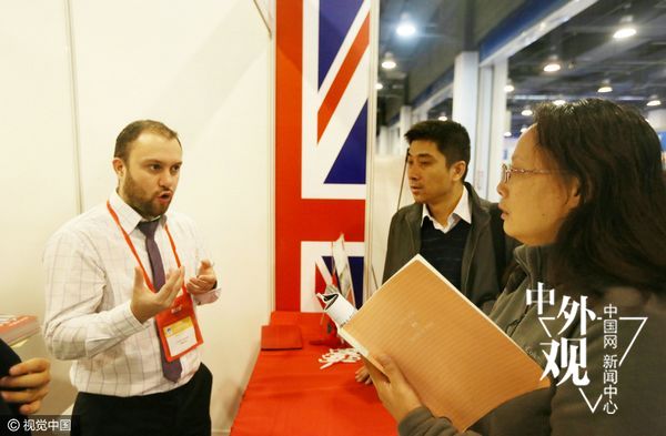 2016年10月22日,北京中國(guó)國(guó)際教育展上,家長(zhǎng)在英國(guó)留學(xué)展臺(tái)咨詢。視覺中國(guó)
