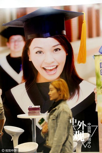 2016年10月22日,北京中國(guó)國(guó)際教育展上,出國(guó)留學(xué)展臺(tái),學(xué)士服畢業(yè)照。視覺中國(guó)