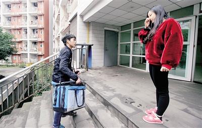 毛召木負責(zé)送餐的區(qū)域位于川外山頂,部分寢室由于摩托車無法到達,只能步行前往。每天的用餐高峰時間,毛召木平均送出60多份外賣。