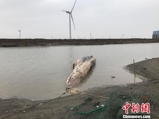 22日一早,中新網(wǎng)記者抵達(dá)位處浦東大治河附近的現(xiàn)場(chǎng)時(shí),殞命鯨魚(yú)已在岸上,據(jù)稱,凌晨4時(shí)左右,此間漁政部門借助漲潮,將鯨魚(yú)拖上岸。