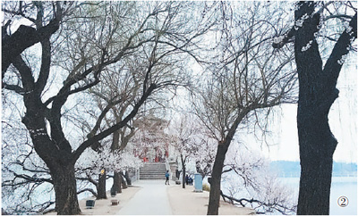 在這座充滿古韻的皇家園林中,陽(yáng)光明媚,湖水清清,桃紅柳綠,生機(jī)勃勃,真可謂“十里桃花”(圖②,王若凈攝)。滿園春色吸引了眾多游客,沉醉花香,流連忘返。