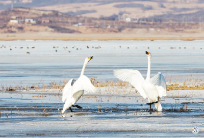 放眼望去,偌大的濕地水岸相依,沼澤遍布,龐大的天鵝群點(diǎn)綴數(shù)公里,尤其在水面寬闊處,成群的天鵝相擁相簇,或悠閑漂游,或嬉戲覓食,“嘎嘎”的叫聲宛若大自然天籟之音的合奏(圖③,張衛(wèi)東攝)。