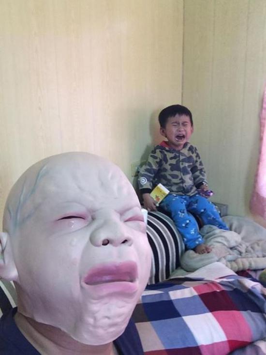 曾姓父親在facebook專頁(yè)“爆廢公社”上傳照片,他戴著的面具表情猙獰,光禿的頭頂還爆現(xiàn)青筋,看上去令人毛骨悚然,難怪把兒子嚇哭。這位爸爸還狡辯說兒子根本不怕,哭鬧只因?yàn)橐缢,他不給喝飲料和吃糖果。