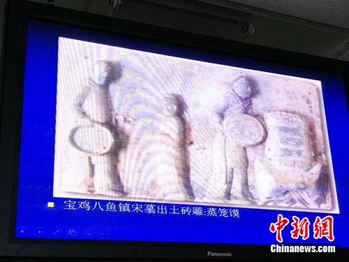 王仁湘在講座中展示考古照片,圖中文物為陜西寶雞八魚鎮(zhèn)宋墓出土的蒸籠圖磚雕。中新網記者 宋宇晟 攝