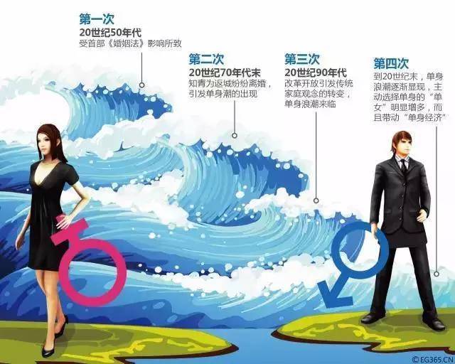 中國內(nèi)地曾經(jīng)出現(xiàn)過幾次單身潮。第一次是在20世紀50年代,首部《婚姻法》帶來了全國的離婚潮;20世紀70年代末,知青為了返城紛紛離婚,引發(fā)了第二次單身潮的出現(xiàn);20世紀90年代以來,改革開放引發(fā)傳統(tǒng)家庭觀念的轉(zhuǎn)變,第三次單身浪潮來臨; 到現(xiàn)在,隨著經(jīng)濟的飛速發(fā)展和女性自主意識的提升,第四次單身浪潮逐漸顯現(xiàn)。