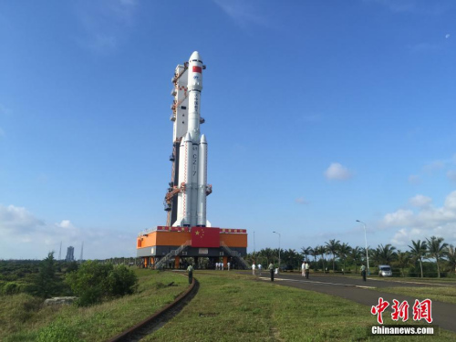 圖為承載著長征七號遙二運(yùn)載火箭與天舟一號貨運(yùn)飛船組合體的活動發(fā)射平臺。陳濤 攝