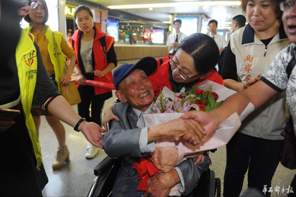 4月19日晚9點(diǎn),成都雙流國際機(jī)場,一架從寶島臺灣飛來的飛機(jī),穩(wěn)穩(wěn)降落在四川的土地上,胡定遠(yuǎn)蹣跚著從機(jī)艙走出,眼前的景象令這位老人眼眶濕潤,“我回家了!