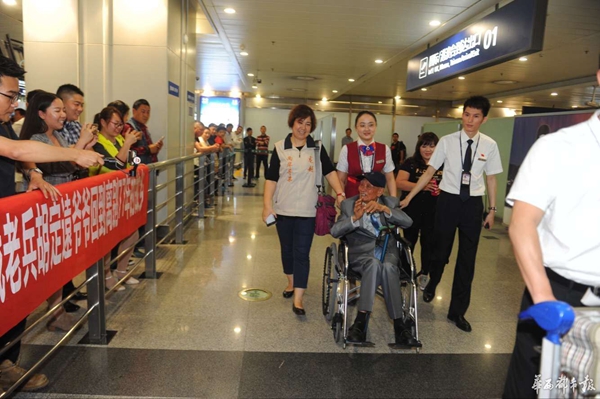 當(dāng)晚9點(diǎn)45分左右,胡定遠(yuǎn)坐在機(jī)場提供的輪椅上,出現(xiàn)在了眾人的視野里。面對前來迎接的志愿者,胡老微笑著,點(diǎn)頭、揮手以示回應(yīng),還用地道的瀘州話不斷說著“謝謝”。同時(shí),他的目光始終在打量周圍的景象,70余年時(shí)光飛逝,這里的景象早非當(dāng)年!肮烙(jì)老家沒人認(rèn)識我了!焙陷p嘆。