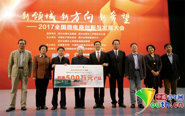 團(tuán)中央“青年之聲”微電商服務(wù)聯(lián)盟副主席、海名微微電商平臺(tái)總裁、新西蘭紐西之謎中國區(qū)首席代表劉曉坤(左五)向北京授漁計(jì)劃公益促進(jìn)中心捐贈(zèng)海名微公司價(jià)值500萬元產(chǎn)品,授漁計(jì)劃公益促進(jìn)中心秘書長高繼輝(左三)接受捐贈(zèng)。左四為十一屆全國人大常委會(huì)副委員長周鐵農(nóng)。中國青年網(wǎng)記者李鐵攝