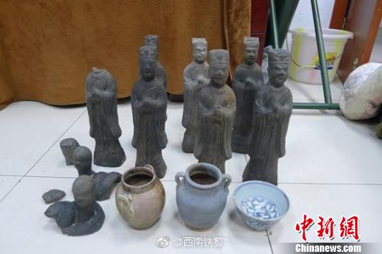 4月10日晚,張某攜帶照明工具及鐵鍬等工具返回工地,并悄悄在此處挖掘。果不其然,這是一處古墓,張某從該處挖出了8個(gè)陶俑和2個(gè)陶罐,帶回家中藏匿。張某在家藏了十幾天,一直未見風(fēng)吹草動(dòng),遂想把這些“寶貝”帶到成都出手,大賺一筆,誰知還沒上火車就露了餡兒,被抓個(gè)正著。