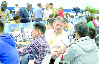 高峰論壇期間,媒體同行之間相互采訪(fǎng),交流報(bào)道心得和對(duì)論壇的印象。光明日?qǐng)?bào)記者 郭紅松攝/光明圖片