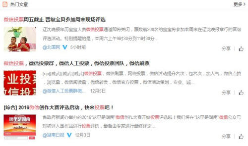 求贊拉票本來是在拼人氣,但也成為一些人的煩惱。為了在“票”數(shù)上一決雌雄,求贊票者不遺余力,撒錢拉人獎(jiǎng)品引誘,各顯其能。對(duì)于接受“點(diǎn)贊”任務(wù)的朋友們,礙于情面,不論事實(shí)怎樣,動(dòng)動(dòng)拇指做個(gè)順?biāo)饲,但時(shí)間久了,也是惹人煩、不勝其擾。可以說,求贊拉票已經(jīng)為朋友圈一大累贅,一大負(fù)擔(dān)。更令人匪夷所思的是,“刷票”,不僅在比實(shí)力,拼人脈,還可以搞“產(chǎn)業(yè)”。在網(wǎng)上搜索“微信投票”,很快就能出現(xiàn)“微信人工刷票”“微信投票群”“微信投票團(tuán)隊(duì)”等收費(fèi)刷票的信息,可見其背后潛藏著的利益鏈條。