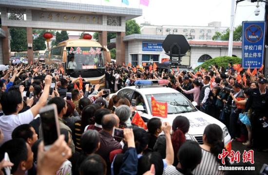 6月5日上午,安徽毛坦廠中學(xué)考生出發(fā),萬(wàn)余民眾冒雨相送。8時(shí)08分,28輛大巴車從毛坦廠校園緩緩開出,毛坦廠鎮(zhèn)過萬(wàn)民眾夾道歡送。 中新社記者 韓蘇原 攝