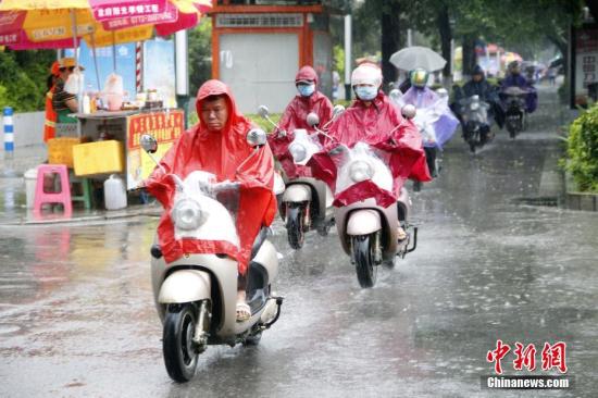 6月16日,廣西柳州市遭暴雨侵襲,民眾穿著雨衣騎電動(dòng)車出行。 中新社記者 朱柳融 攝