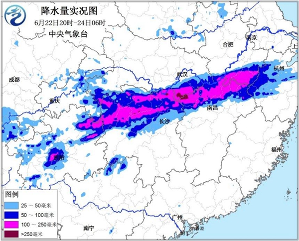 22日夜間以來(lái),貴州至江南北部一帶出現(xiàn)區(qū)域性強(qiáng)降雨過(guò)程,貴州中部和東北部、湖南北部、湖北東南部、江西北部、安徽南部等地累計(jì)雨量超過(guò)100毫米,湖北咸寧、湖南岳陽(yáng)和常德、江西九江等局地達(dá)250~365毫米。