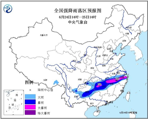 中央氣象臺(tái)將暴雨預(yù)警升級(jí)為橙色。中央氣象臺(tái)6月24日10時(shí)發(fā)布暴雨橙色預(yù)警:預(yù)計(jì),6月24日14時(shí)至25日14時(shí),江南中北部以及重慶南部、云南東北部、貴州南部和東部、廣西西北部等地有大到暴雨,其中,湖南西北部、江西北部、湖北東南部、安徽南部、浙江北部等地的部分地區(qū)有大暴雨,江西東北部、安徽南部、浙江西部局地有特大暴雨(250~260毫米)。上述部分地區(qū)有短時(shí)強(qiáng)降水、局地伴有雷暴大風(fēng)等強(qiáng)對(duì)流天氣,最大小時(shí)雨強(qiáng)30~60毫米,局地可達(dá)80毫米。