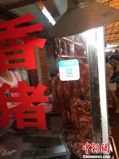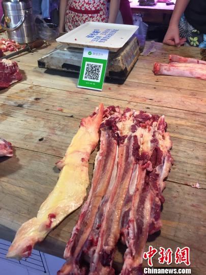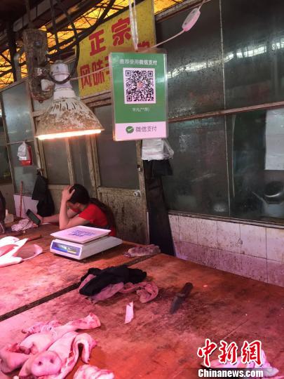 圖為燎源菜市的豬肉攤位上方懸掛著收款二維碼。 周瀟男 攝
