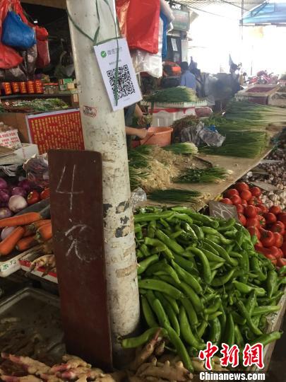圖為燎源菜市的蔬菜攤位上方懸掛著收款二維碼!≈転t男 攝