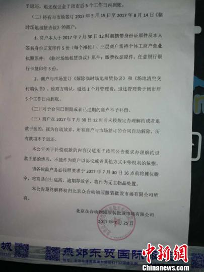 中新網(wǎng)北京7月26日電 (記者 曾鼐)北京“動批”眾合市場26日貼出正式疏解公告,經(jīng)營18年的眾合將于本周日正式閉市。