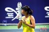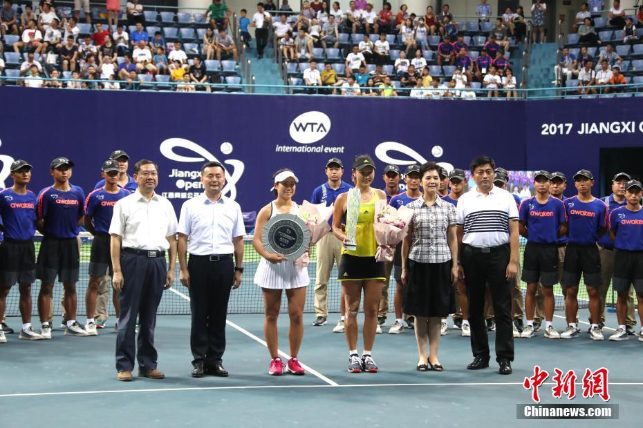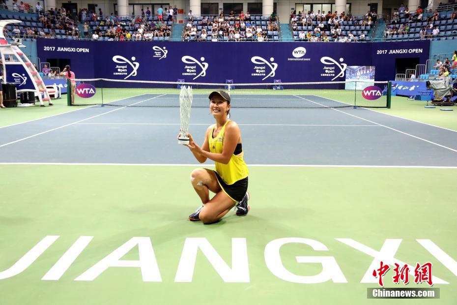 7月30日,奪得冠軍的中國金花彭帥站在寫有“JIANGXI”的字母前留影。當(dāng)天,2017江西網(wǎng)球公開賽決賽在南昌打響,中國女網(wǎng)名將彭帥以6比3、6比2橫掃日本選手日比野菜緒,奪得賽事冠軍,同時(shí)這也是她第二次在南昌登頂。 中新社記者 劉占昆 攝 -