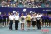 7月30日,主辦方為獲得冠、亞軍的中國選手彭帥(右三)、日本選手日比野菜緒頒獎(jiǎng)。當(dāng)天,2017江西網(wǎng)球公開賽決賽在南昌打響,中國女網(wǎng)名將彭帥以6比3、6比2橫掃日本選手日比野菜緒,奪得賽事冠軍,同時(shí)這也是她第二次在南昌登頂。 中新社記者 劉占昆 攝