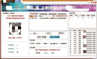 隨后,北青報記者在淘寶上隨機找了一家店鋪,對另一功能相同的軟件進行咨詢。該店家表示可以試用,并給北青報記者傳來了試用版的軟件,該軟件的操作與上述網(wǎng)站的產(chǎn)品相似,均是編輯好文字及圖片內(nèi)容后生成二維碼,他人掃碼時只要不關(guān)閉電腦即可。北青報記者統(tǒng)計發(fā)現(xiàn),從掃碼到系統(tǒng)自動向300多名好友發(fā)送完消息只需五分鐘,但約有20名好友沒有接收到該消息。該淘寶賣家稱,該軟件由自己的團隊協(xié)作研發(fā),群發(fā)上限為800人,目前市場價為一年500元。
