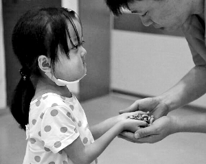 7歲的河南登封女孩王越患有一種非常罕見的病—石骨癥,隨時可能猝死。妹妹剛剛1歲半,也被查出患同樣的病。父親王向東已在骨髓庫找到全相合供者,待供者檢查身體合格,將會為兩個孩子做骨髓移植。但一個孩子治療費用至少50萬元。已花光了家里全部積蓄的王向東,這次來北京,借遍親朋好友才借了不到20萬元,實在無力承擔(dān)兩個孩子的移植費用。聽到爸爸悄悄跟媽媽說借的錢遠遠不夠,王越從包里拿出存錢罐,遞給爸爸,“給妹妹治病吧,我大了,不治也沒關(guān)系的,這是我攢下的錢,都拿去吧。”(大河報)