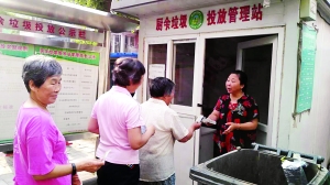 在海淀區(qū)蘇州橋西社區(qū),有一處固定的廚余垃圾投放管理站。每天早上7點到9點,下午5點到7點,小區(qū)居民會將裝好的廚余垃圾投放到這里。蘇州橋西社區(qū)居委會主任李春燕說,2014年2月,小區(qū)實施“定時定點”投放廚余垃圾以來,500戶社區(qū)居民中至少有60%的居民養(yǎng)成了主動垃圾分類的習(xí)慣。