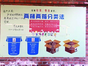 “我們選擇了最簡便易行的方法,兩桶兩箱分類法,兩桶即一個桶裝廚余垃圾,另一個桶裝其他生活垃圾;兩箱即一個箱裝可回收物品,另一個箱裝電池、燈管等有毒有害物品!碧片摤撜f,接下來的兩個月時間里,他們辦了32次講座,通過集中培訓(xùn)、入戶宣傳、廣播宣傳、展板宣傳等方式,主要宣傳兩個重點,為什么做和如何做。