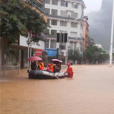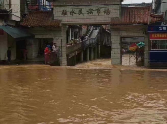 目前當(dāng)?shù)剡在持續(xù)降雨中。7條街道被水浸泡。當(dāng)?shù)卣M織交警上街疏導(dǎo)交通,消防、武警出動(dòng)橡皮艇轉(zhuǎn)移群眾。沿街商鋪的店主在收到水情通報(bào)后,在昨天已經(jīng)開(kāi)始有序轉(zhuǎn)移物資。