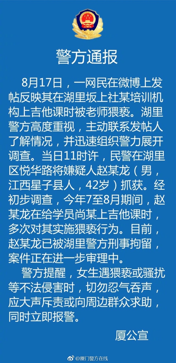 通報顯示,8月17日,一網(wǎng)民在微博上發(fā)帖反映其在湖里坂上社某培訓機構(gòu)上吉他課時被老師猥褻。廈門湖里警方高度重視,主動聯(lián)系發(fā)帖人了解情況,并迅速組織警力展開調(diào)查。